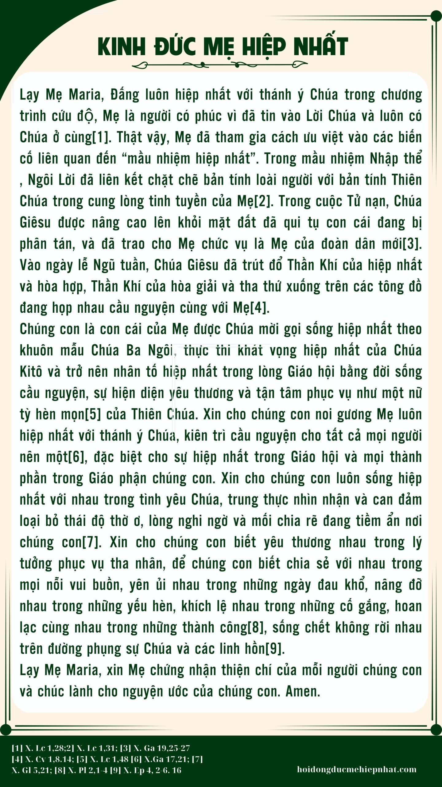 Chúng con là con cái của Mẹ được Chúa mời gọi sống hiệp nhất theo khuôn mẫu Chúa Ba Ngôi, thực thi khát vọng hiệp nhất của Chúa Kitô và trở nên nhân tố hiệp nhất trong lòng Giáo hội bằng đời sống cầu nguyện, sự hiện diện yêu thương và tận tâm phục vụ như một nữ tỳ hèn mọn[5] của Thiên Chúa. Xin cho chúng con noi gương Mẹ luôn hiệp nhất với thánh ý Chúa, kiên trì cầu nguyện cho tất cả mọi người nên một[6], đặc biệt cho sự hiệp nhất trong Giáo hội và mọi thành phần trong Giáo phận chúng con. Xin cho chúng con luôn sống hiệp nhất với nhau trong tình yêu Chúa, trung thực nhìn nhận và can đảm loại bỏ thái độ thờ ơ, lòng nghi ngờ và mối chia rẽ đang tiềm ẩn nơi chúng con[7]. Xin cho chúng con biết yêu thương nhau trong lý tưởng phục vụ tha nhân, để chúng con biết chia sẻ với nhau trong mọi nỗi vui buồn, yên ủi nhau trong những ngày đau khổ, nâng đỡ nhau trong những yếu hèn, khích lệ nhau trong những cố gắng, hoan lạc cùng nhau trong những thành công[8], sống chết không rời nhau trên đường phụng sự Chúa và các linh hồn[9].