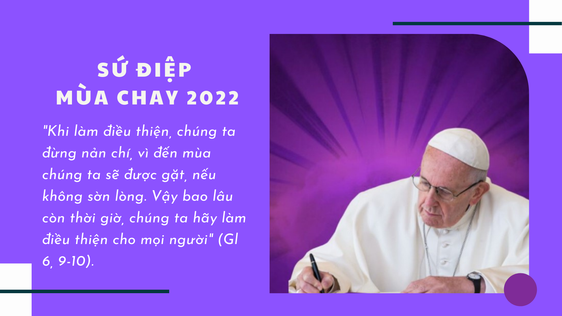 Mùa Chay là thời gian thuận tiện cho việc canh tân cá nhân và cộng đoàn, dẫn chúng ta đến Lễ Phục Sinh của Chúa Giêsu Kitô, Đấng đã chết và sống lại. Đối với hành trình Mùa Chay năm 2022, sẽ rất ích lợi cho chúng ta khi chúng ta suy gẫm lời khuyên của Thánh Phaolô dành cho các tín hữu Galat: “Khi làm điều thiện, chúng ta đừng nản chí, vì đến mùa chúng ta sẽ được gặt, nếu chúng ta không sờn lòng. Vậy bao lâu còn cơ hội (kairos), chúng ta hãy làm điều thiện cho mọi người” (Gl 6,9-10)