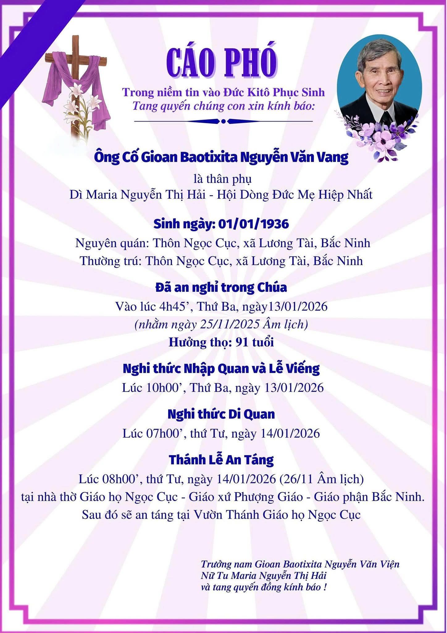 Tin Hội Dòng, Tin TứcCáo phó Ông cố Gioan Baotixita Nguyễn Văn Vang, thân phụ dì Maria Nguyễn Thị Hải Posted on 13 Tháng Một, 202613 Tháng Một, 2026 by hiepnhat 13 Th1 Lượt xem: 36 Xin Đức cha, quý cha và cộng đoàn cầu nguyện cho linh hồn Ông cố Gioan Baotixita mới qua đời. Lớp Giáo Lý Nơi Vùng Truyền Giáo Ba Bể Thư mời Họp mặt Liên Tu Sĩ 2026