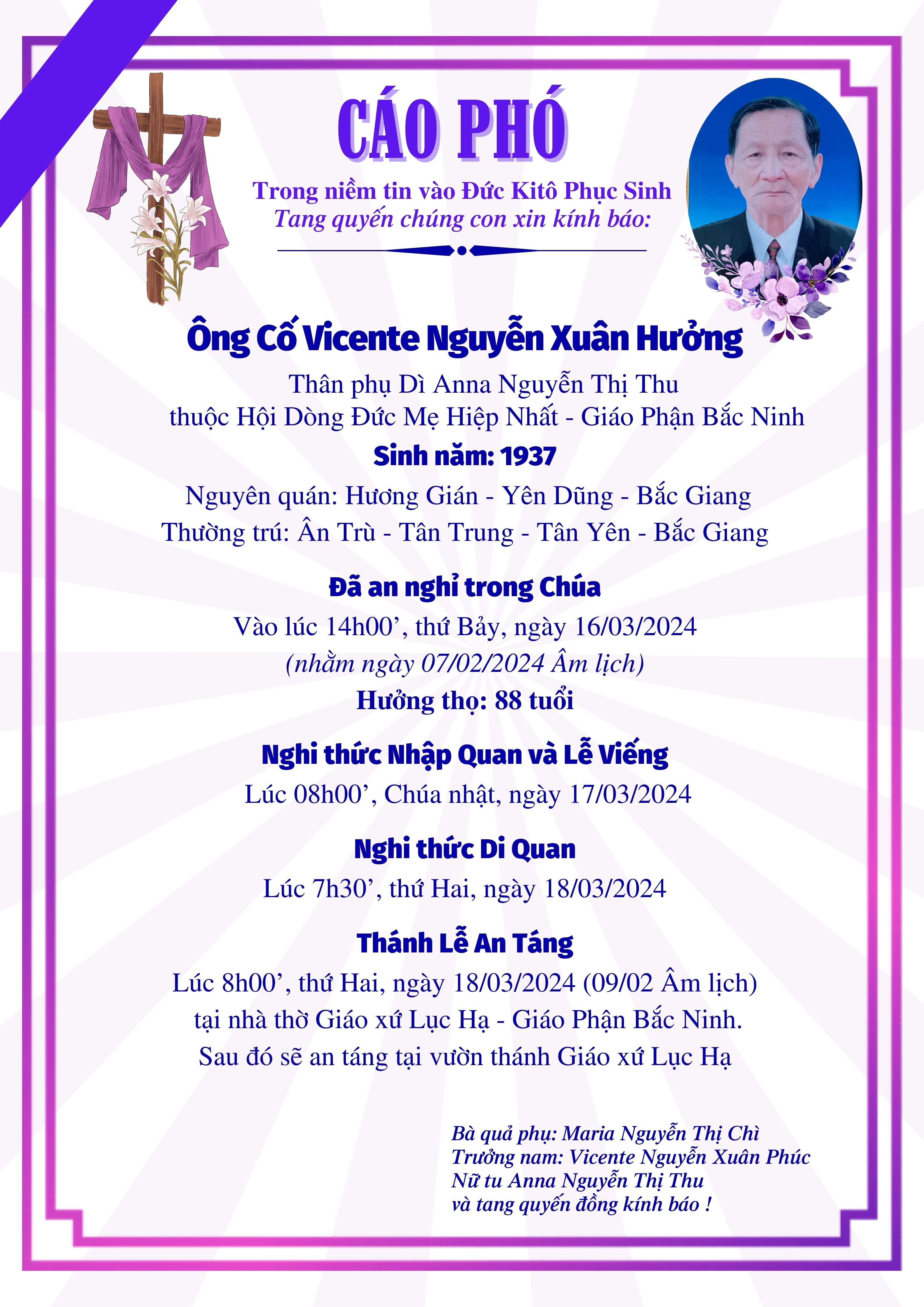 Thông Báo, Tin Hội Dòng, Tin TứcCáo phó ông cố Vicente, thân phụ dì Anna Nguyễn Thị Thu Posted on 16 Tháng Ba, 202416 Tháng Ba, 2024 by hiepnhat 16 Th3 Lượt xem: 185 Thứ Bảy tuần IV mùa Chay Chúa Nhật V mùa Chay – năm B