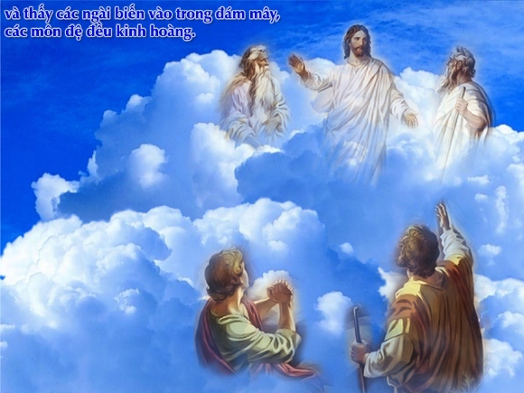 2 Khi ấy, Đức Giê-su đem các ông Phê-rô, Gia-cô-bê và Gio-an đi theo mình. Người đưa các ông đi riêng ra một chỗ, chỉ mình các ông thôi, tới một ngọn núi cao. Rồi Người biến đổi hình dạng trước mắt các ông. 3 Y phục Người trở nên rực rỡ, trắng tinh, không có thợ nào ở trần gian giặt trắng được như vậy. 4 Và ba môn đệ thấy ông Ê-li-a cùng ông Mô-sê hiện ra đàm đạo với Đức Giê-su. 5 Bấy giờ, ông Phê-rô thưa với Đức Giê-su rằng : “Thưa Thầy, chúng con ở đây, thật là hay ! Chúng con xin dựng ba cái lều, một cho Thầy, một cho ông Mô-sê, và một cho ông Ê-li-a.” 6 Thực ra, ông không biết phải nói gì, vì các ông kinh hoàng. 7 Bỗng có một đám mây bao phủ các ông. Và từ đám mây, có tiếng phán rằng : “Đây là Con Ta yêu dấu, hãy vâng nghe lời Người.” 8 Các ông chợt nhìn quanh, thì không thấy ai nữa, chỉ còn Đức Giê-su với các ông mà thôi.