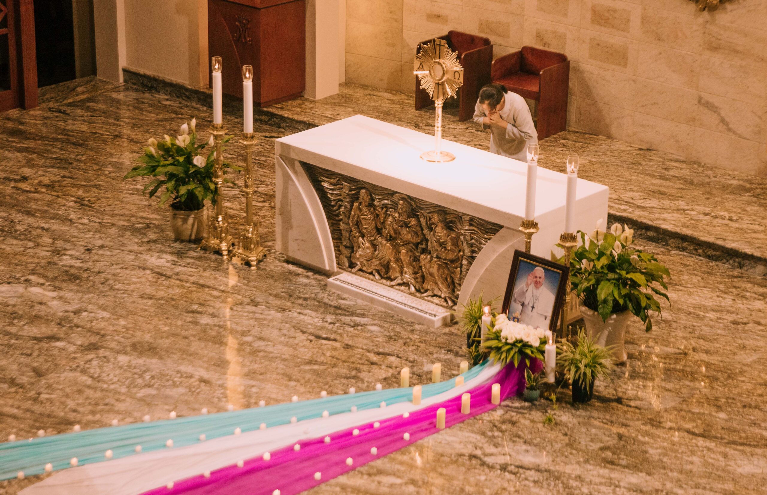 Tối thứ Năm, lúc 19h30, tại nguyện đường Cộng đoàn Nhà Mẹ Hội dòng Đức Mẹ Hiệp Nhất, chị em trong hội dòng đã cùng quy tụ bên ánh nến lung linh để dâng lời cầu nguyện cách đặc biệt cho Đức Cố Thánh Cha Phanxicô – người cha chung thân yêu vừa được Chúa gọi về.