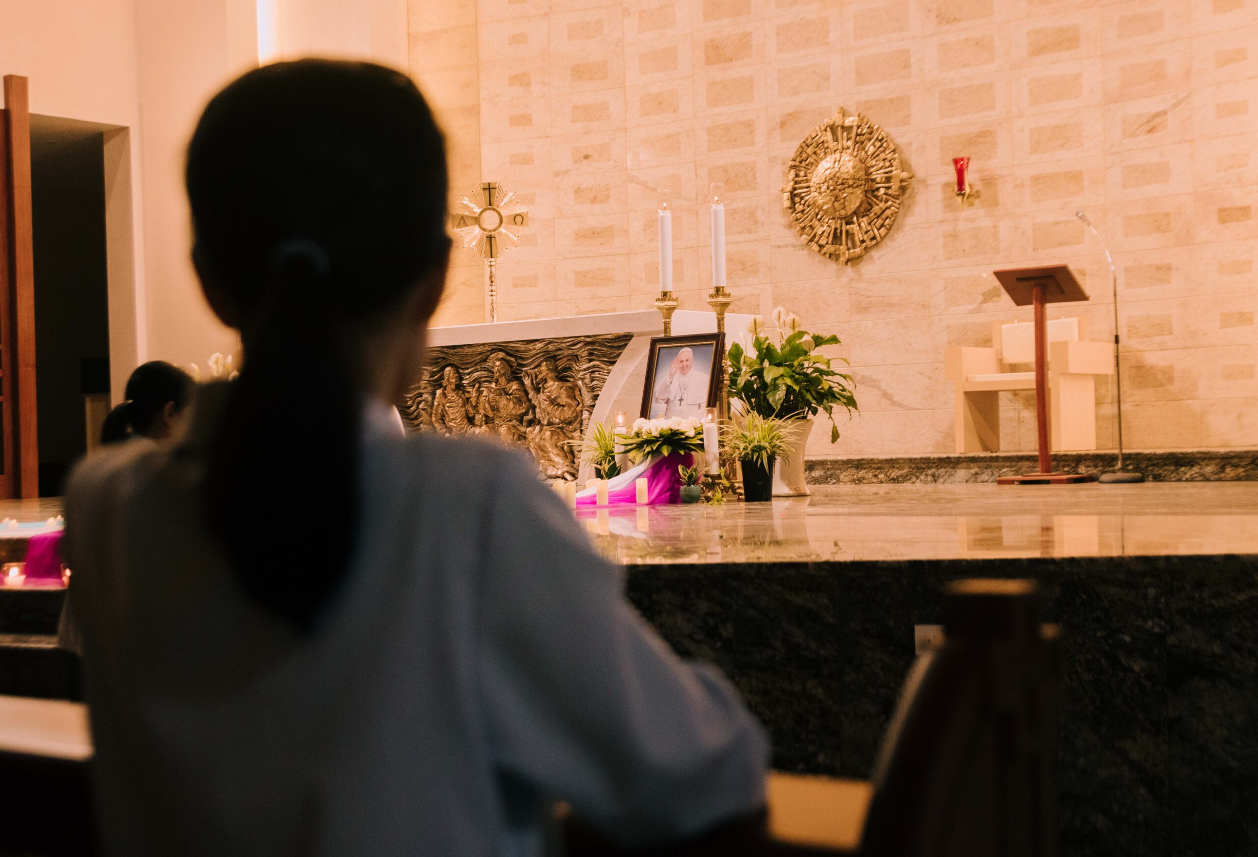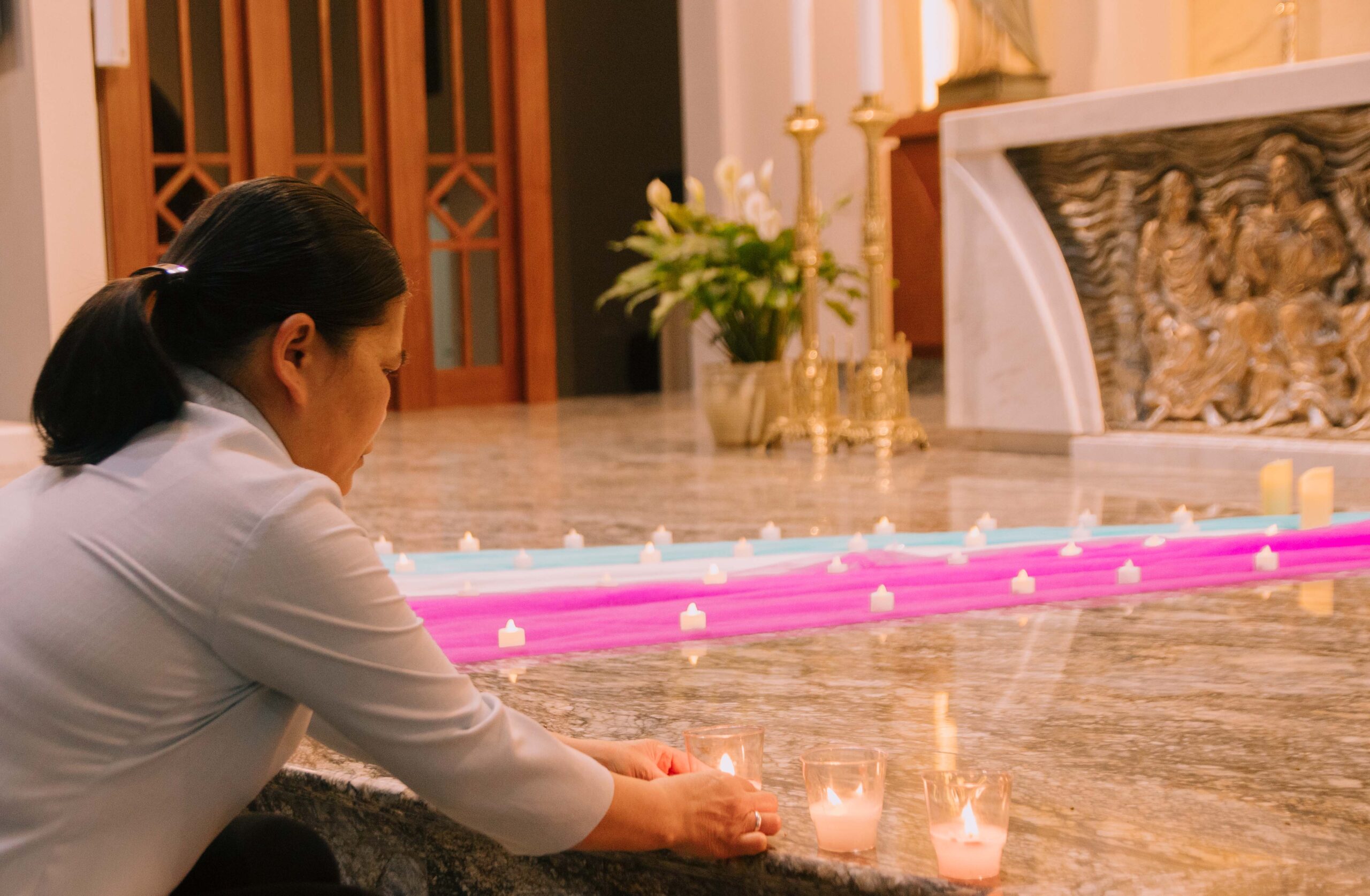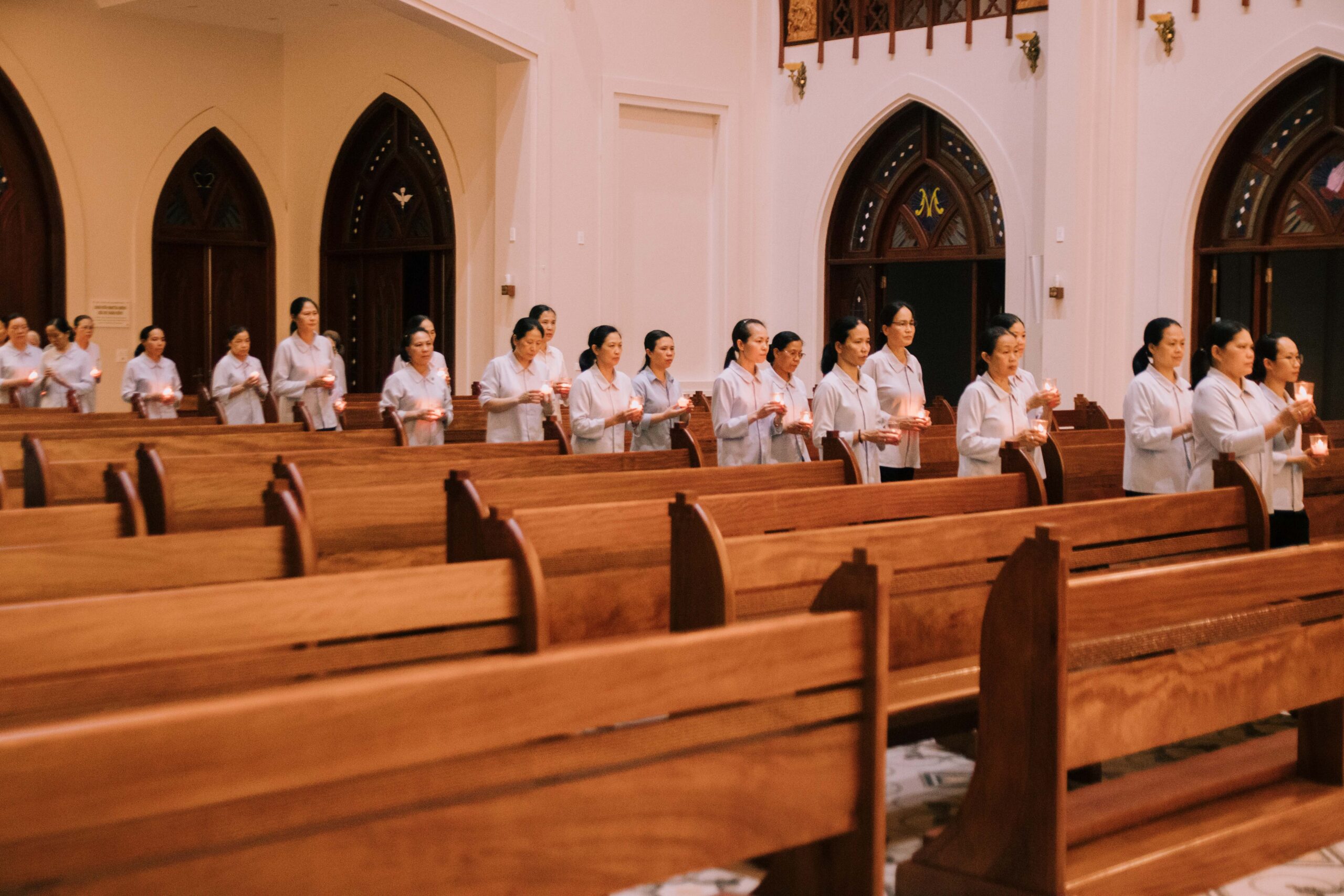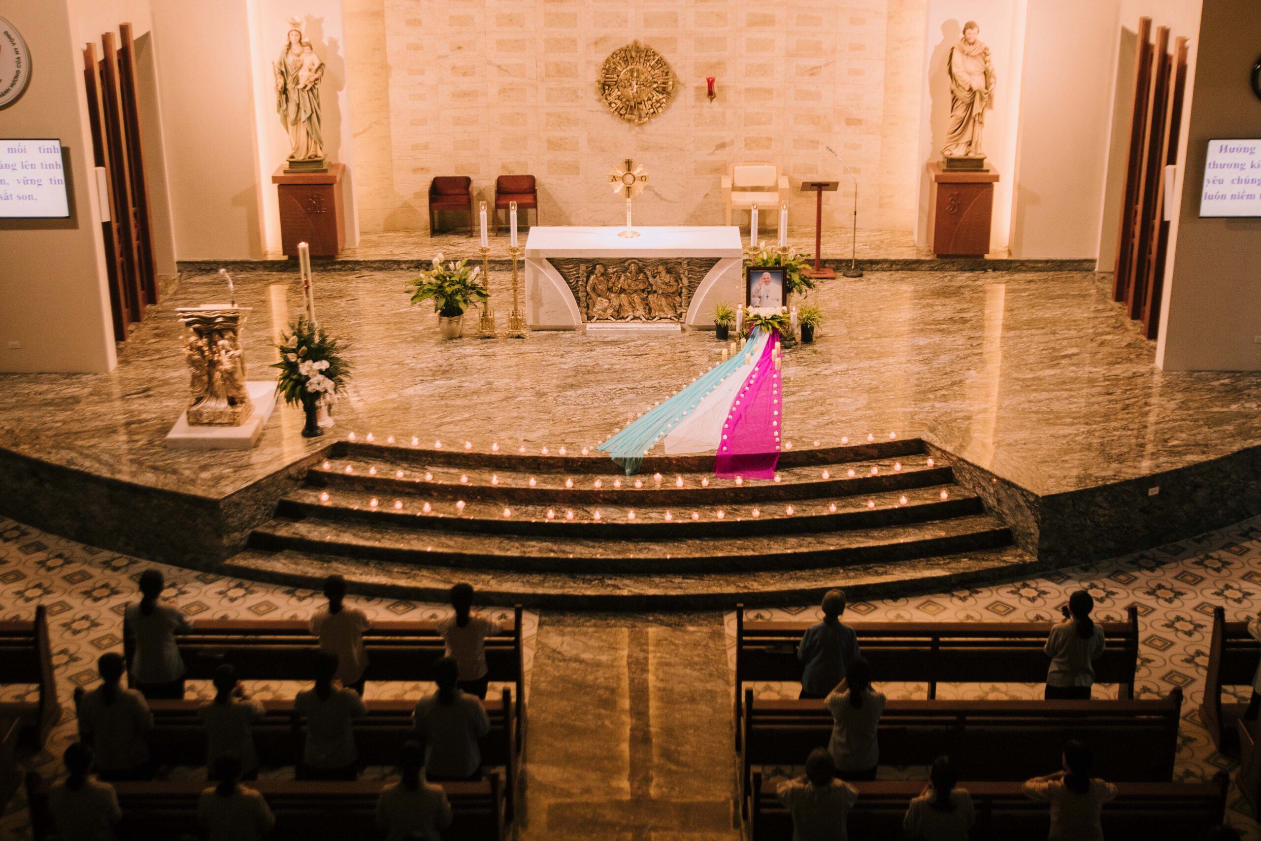 Tối thứ Năm, lúc 19h30, tại nguyện đường Cộng đoàn Nhà Mẹ Hội dòng Đức Mẹ Hiệp Nhất, chị em trong hội dòng đã cùng quy tụ bên ánh nến lung linh để dâng lời cầu nguyện cách đặc biệt cho Đức Cố Thánh Cha Phanxicô – người cha chung thân yêu vừa được Chúa gọi về.
