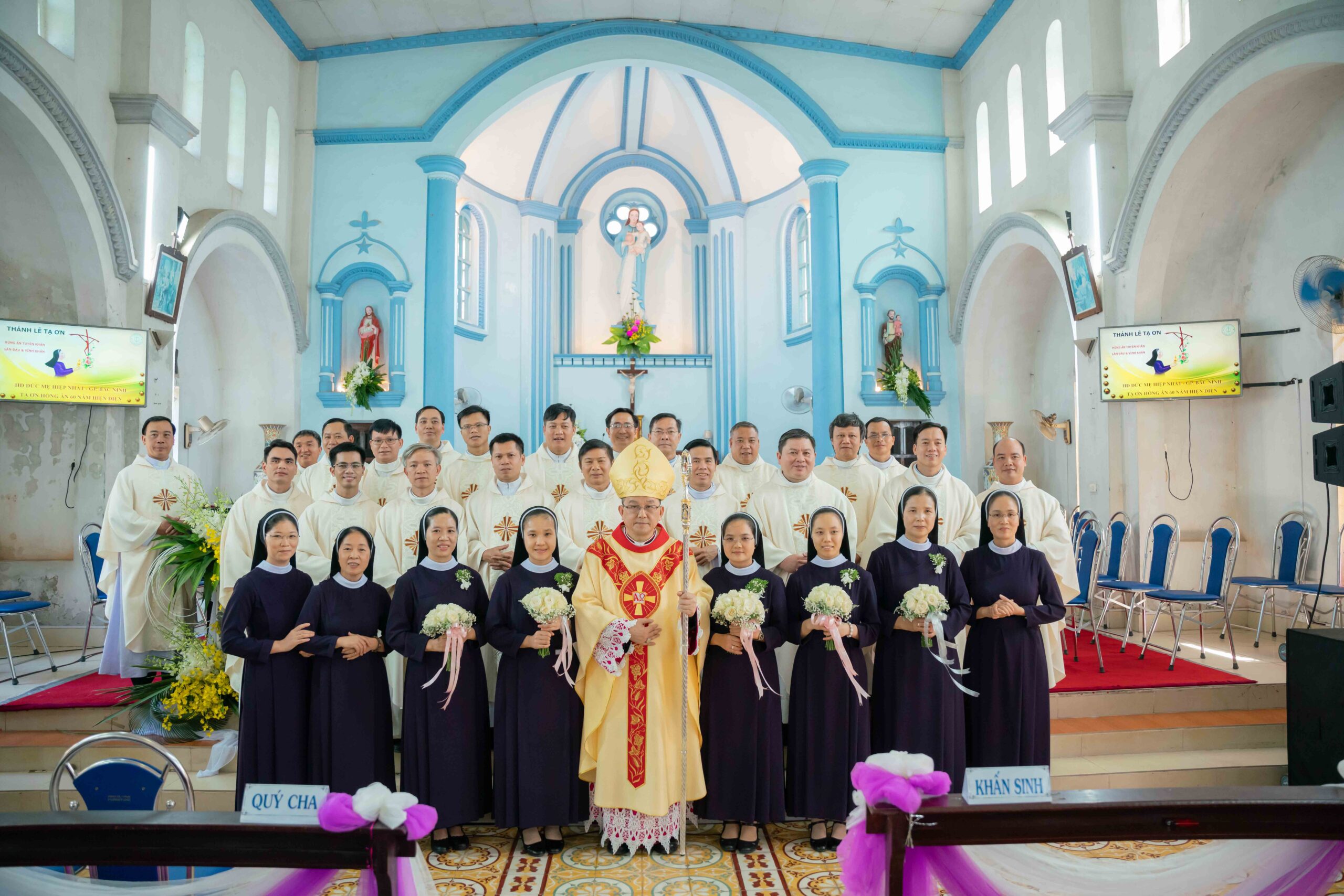 Trong bầu khí linh thiêng và vui mừng, vào lúc 9h00 sáng thứ Hai ngày 09/10/2023, tại giáo xứ Đạo Ngạn, Đức Cha Giuse Đỗ Quang Khang đã chủ sự thánh lễ Tạ ơn 60 năm hình thành và phát triển Hội dòng Đức Mẹ Hiệp Nhất. Cũng trong ngày hồng ân này, Đức Cha Giuse đã chủ sự nghi thức khấn dòng cho 5 Nữ tu của Hội dòng. Lời giao ước mà 2 Nữ tu tuyên khấn lần đầu và 3 Nữ tu tuyên khấn trọn đời dâng lên Thiên Chúa hôm nay, là lời xác tín mạnh mẽ về một tình yêu thuộc trọn về Đức Kitô và noi gương Đức Maria, Đấng luôn hiệp nhất với thánh ý Thiên Chúa trong mầu nhiệm Ngôi Lời nhập thể như một nữ tỳ hèn mọn.