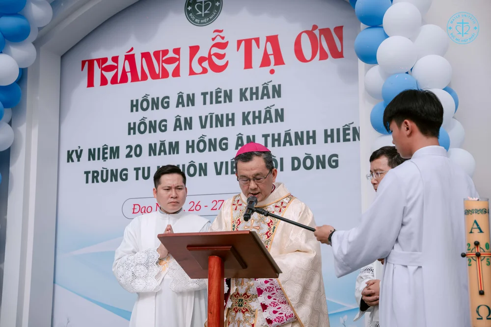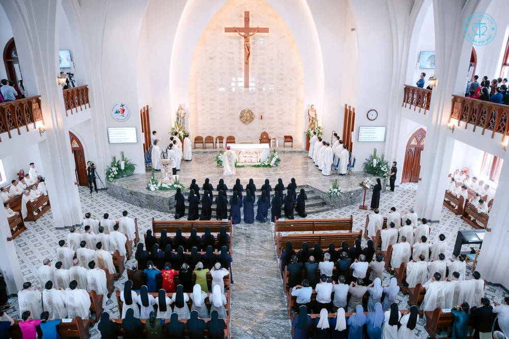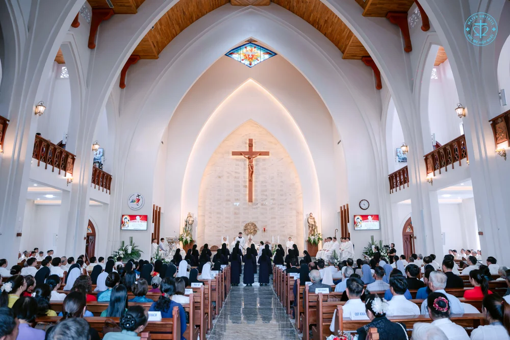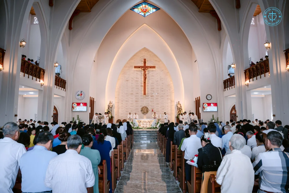 Thánh lễ được cử hành vào lúc 8h30, do Đức Cha Giuse chủ sự, cùng quý Cha Quản hạt, quý Cha trong và ngoài Giáo phận đồng tế. Hiện diện trong ngày hồng phúc còn có quý Phó tế, quý Chủng sinh, quý Tu sĩ nam nữ, quý ân nhân, thân nhân, và đông đảo chị em trong đại gia đình Hội Dòng Đức Mẹ Hiệp Nhất.