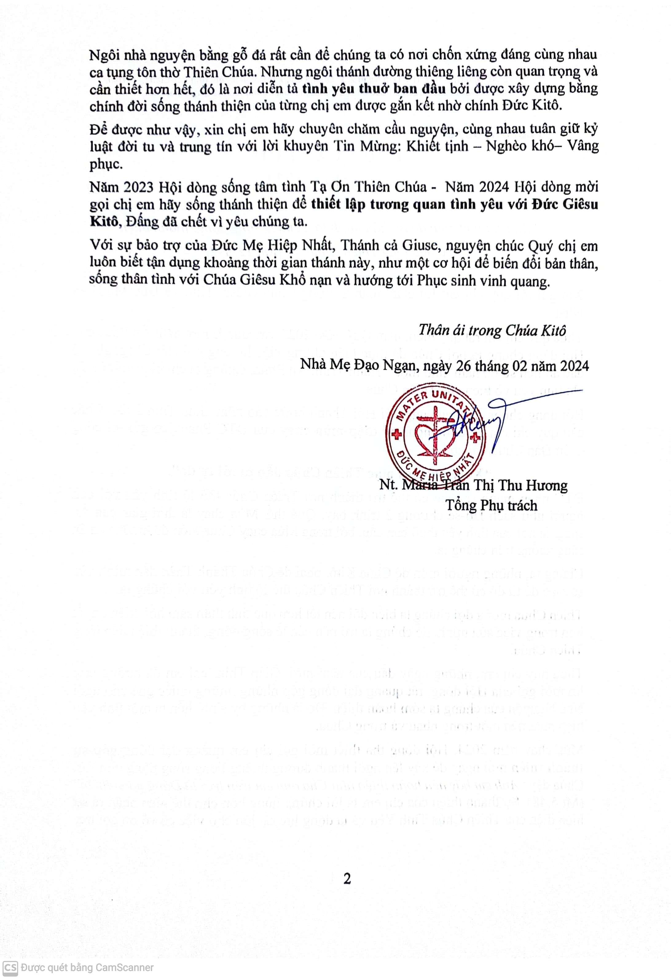 Xin gửi tới quý chị em lời chào thân ái trong Chúa Giêsu Kitô và Đức Mẹ Hiệp Nhất. Thưa quý chị em rất quý mến, năm Quý Mão 2023 vừa qua là một năm Ân Phúc cho Hội dòng chúng ta bởi Chúa đã thực hiện những việc lạ lùng nơi Hội dòng, ghi lại dấu ấn lịch sử 60 năm như một – Hành Trình Ân Phúc. Chúng ta chỉ biết cúi đầu Tạ Ơn tình yêu vô biên của Thiên Chúa…